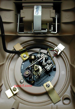 up in the standard "Western" position. Also note the fabricated lever to translate the motion of the cradle buttons to activate the plunger on the network assembly on the bottom plate of the set. I believe this is unique to this set. |