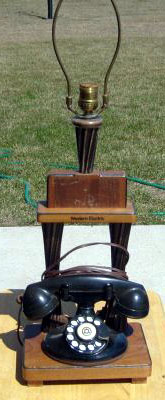 exchanges, all the old magneto (crank) telephones had to be replaced. Many sets ended up in landfills or scrap yards, but many were recycled in other forms. Lamps were among the most popular. Some were made by Bell System employees to be used as retirement gifts or in commemoration of an event. Others were modified and sold by Junior Achievement groups. Publications such as Popular Mechanix published do-it-yourself articles on how to make phone lamps. Lamps were made by professional lamp makers and by amateur tinkerers. In most cases, the phones were considered worthless as phones, but had some value as decorative and useful items. They were usually damaged in some way to incorporate the lamp components. Drilling large holes through the handset and phone housing were common. Phone collectors are continually amazed at the creativity and effort that went into some of the conversions. We also look for lamps made from what are now considered collectible phones and hope to find some that can be converted back to phones or provide scarce parts for phone restorations. This page contains photos that were harvested from auction sites and contributed by site visitors, and are presented with minimal comment. Enjoy. |