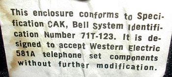 arrived. Labels on subset (above) and set (below), provided details and directed the customer to arrange for the installation of Bell System active components. At installation, the Bell System installer put in the receiver and transmitter elements, dial and 581A -- then tested the phone. If service was discontinued, the phone company had the option to remove the Bell System components. In non-Bell areas, similar arrangements were made with the local phone companies, who would typically use AE/GTE or Stromberg components. |