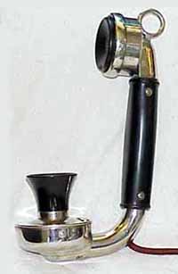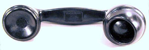 WE 1001 Handset 244 carbon transmitter, 131 watch-case receiver Originally used by linemen. Variations with pushbuttons could be used as desk stand replacements (e.g. 1040AL). Introduced ca. 1902. Produced and in service for decades. Numerous variations were produced with different switch and cord configurations for many uses. See the catalogs and BSPs for details. Model numbers were stamped on the handle and omitted the initial "100." e.g. 1A, 1C, 1H, 1J, etc. |