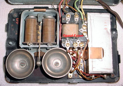 Most found D-97464s have a cast metal housing. The base plate and internal components appear identical to the bakelite set above. Metal sets were made in both the first and second quarters of 1936 - marked I 36 and II 36. A handset that looked a lot like the F1 production handset was used on some of the later sets. The transmitter cap was made in 2 pieces, with a screen similar to that on the E handsets held in place with a bakelite ring. |